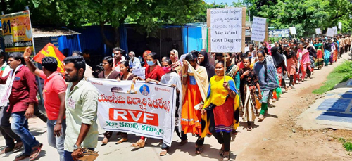 పల్లెవెలుగు కల్లూరు అర్బన్ : పాణ్యం నియోజకవర్గ కేంద్రం, మండల కేంద్రంలో ప్రభుత్వ డిగ్రీ కళాశాల, పాలిటెక్నిక్ కళాశాలలు లేక పోవడంతో విద్యార్ధులు తీవ్ర ఇబ్బందులకు గురవుతున్నారని, వెంటనే కళాశాలల ఏర్పాటుకు చర్యలు తీసుకోవాలని డిమాండ్ చేశారు రాయలసీమ విద్యార్ధి ఫెడరేషన్ (ఆర్వీఎఫ్ ) రాష్ట్ర అధ్యక్షులు , ఫార్వర్డ్ బ్లాక్ పార్టీ రాష్ట్ర కార్యవర్గ సభ్యులు రామినేని రాజునాయుడు. పాణ్యంలో డిగ్రీ కళాశాల ఏర్పాటు చేయాలని డిమాండ్ చేస్తూ… బుధవారం ఫార్వర్డ్ బ్లాక్ పార్టీ , ఆర్వీఎఫ్ , బీసీ – ఎస్సీ – ఎస్టీ – మైనారిటీ విద్యార్ధి , యువజన సమైఖ్య , ఆలిండియా స్టూడెంట్స్ బ్లాక్ ఆధ్వర్యంలో పాణ్యం ప్రభుత్వ జూనియర్ కాలేజీ నుండి వందలాది మంది విద్యార్ధినీ , విద్యార్ధులతో భారీ ర్యాలీ నిర్వహిస్తూ జాతీయ రహదారిపై పెద్ద ఎత్తున రాస్తారోకో నిర్వహించారు.